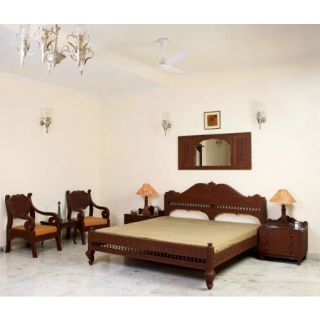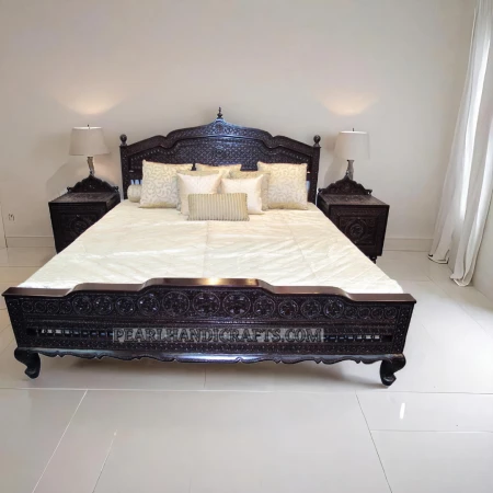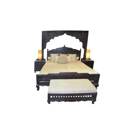 This Beautiful Indian Bed made of fine quality teak wood with deep and detailed carving. The head board of this bed is lavishly carved over solid teak wood with matching carved foot board. The side planks that attach the head board and foot board are also finely carved in same patterns. Matching bed sides / night stands with 3 drawers or one drawer and one wardrobe( can be customize) make this bed a perfect bed for your bedroom and it matches any type of interior.