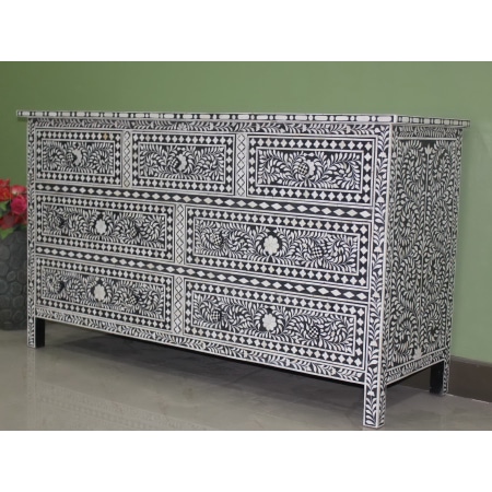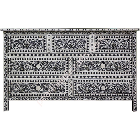 This versatile piece of Bone inlay chest of drawers has 7 drawers to store all of your treasures and could be used in a living room, bedroom, entry or hallway.