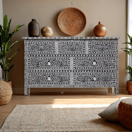 The bone inlay furniture is made in the magical region of Rajasthan India, using bone and mother of pearl shell from Naturally dead Camel and cow.