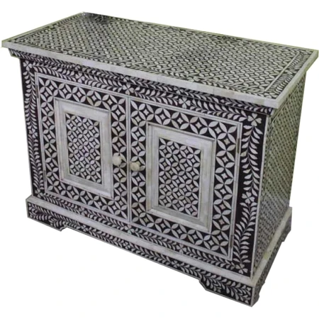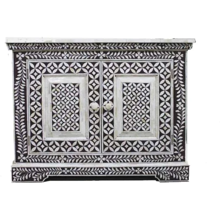 The bedside table has intricate floral details as well as gorgeous carved bone knobs, which create a stunning contrast against the black and white combination. Framed by an eye-catching floral vector design, this two-door camel bone inlay dresser will decorate any room to perfection. The doors swing open wide to reveal ample room and shelf space so that you can store virtually anything you want.