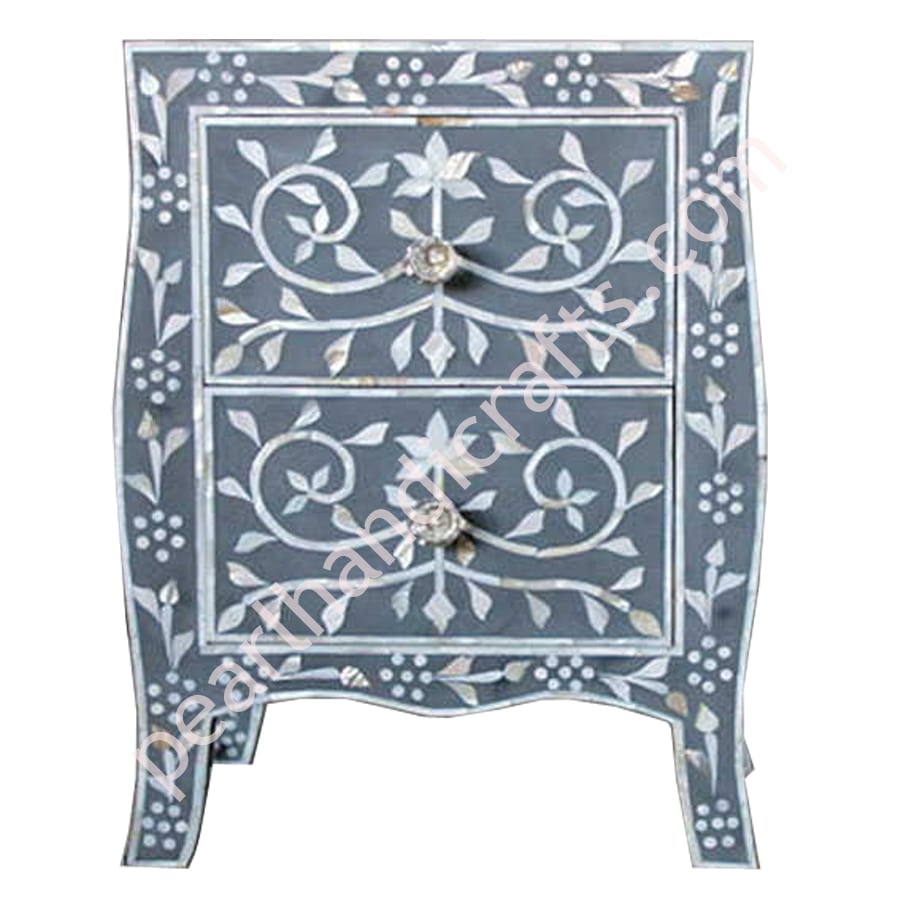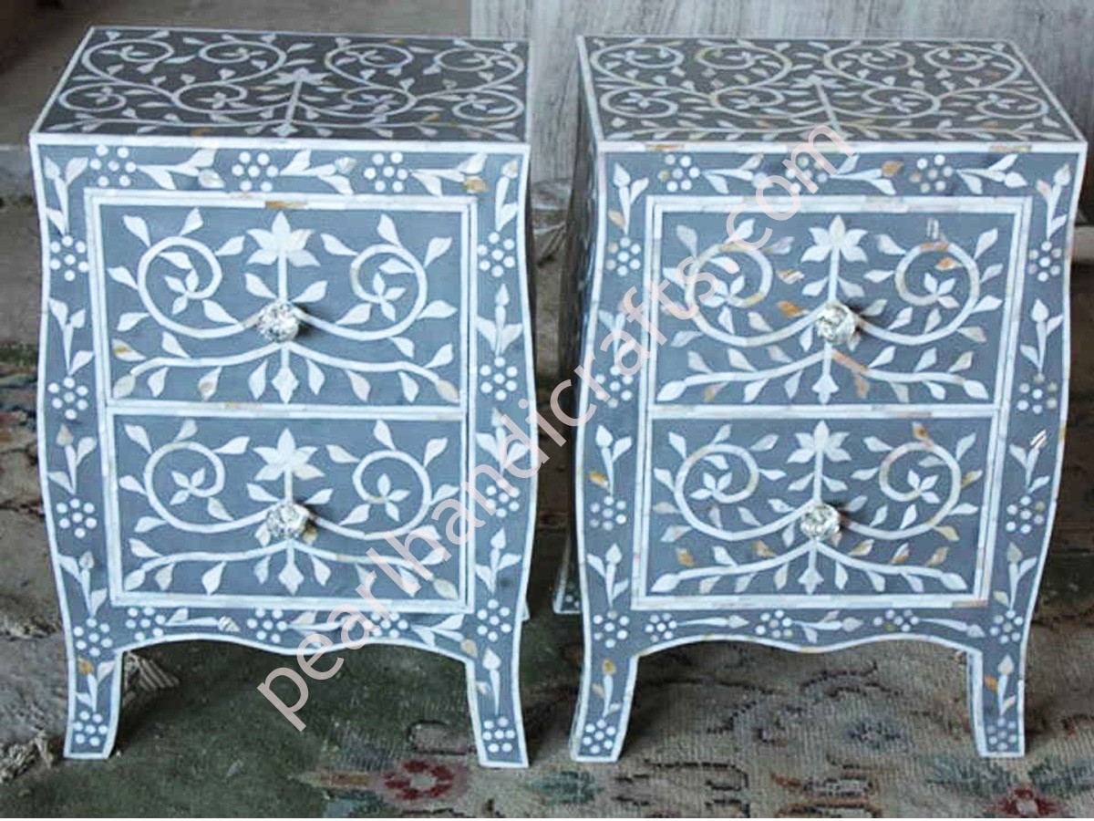 The bone inlay or Mother of pearl night stands and chest of drawers are made in the magical region of Rajasthan India, using bone and mother of pearl shell from Naturally dead Camel and cow. NO any animal harmed for the raw material.