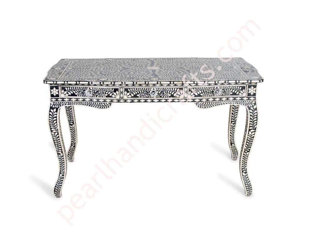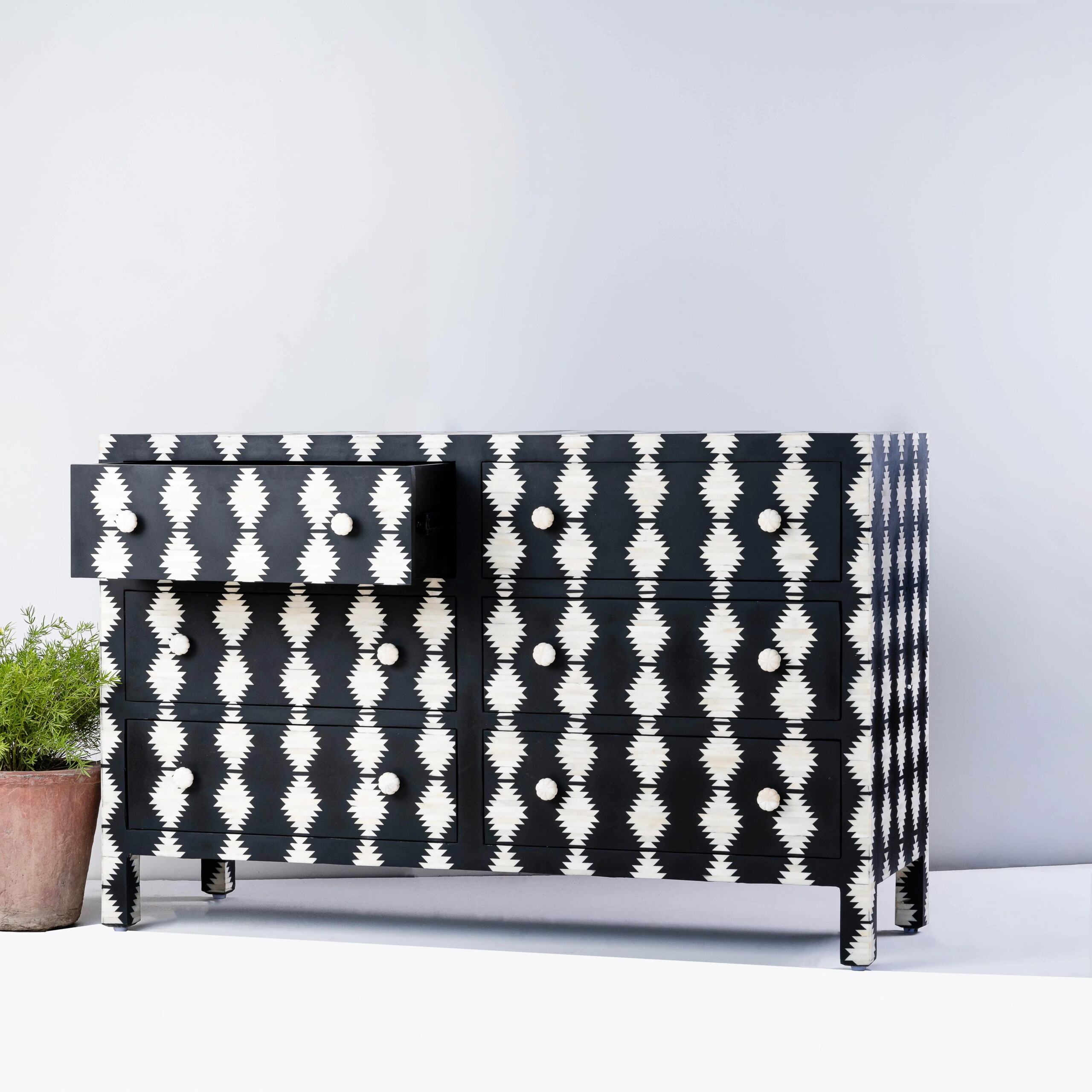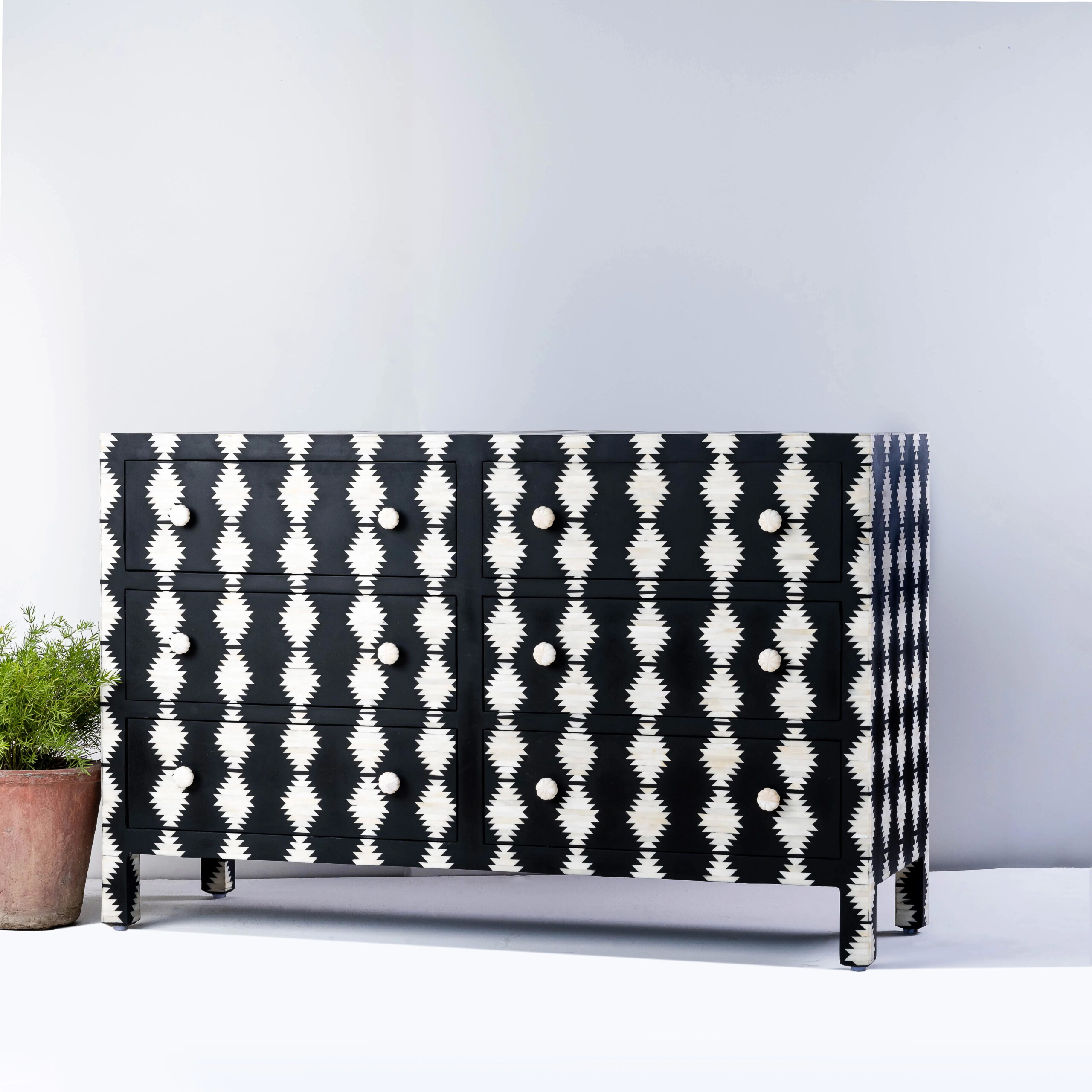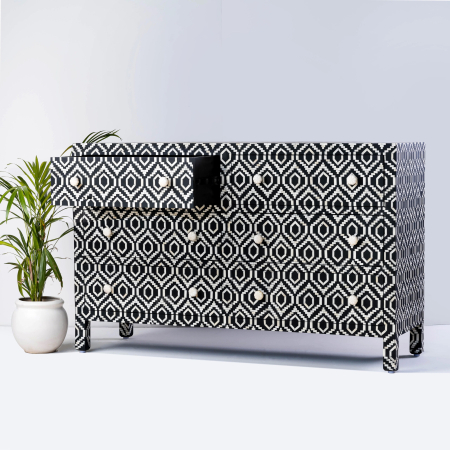 The bedside table has intricate floral details as well as gorgeous carved bone knobs, which create a stunning contrast against the black and white combination. Framed by an eye-catching floral vector design, this two-door camel bone inlay dresser will decorate any room to perfection. The doors swing open wide to reveal ample room and shelf space so that you can store virtually anything you want.