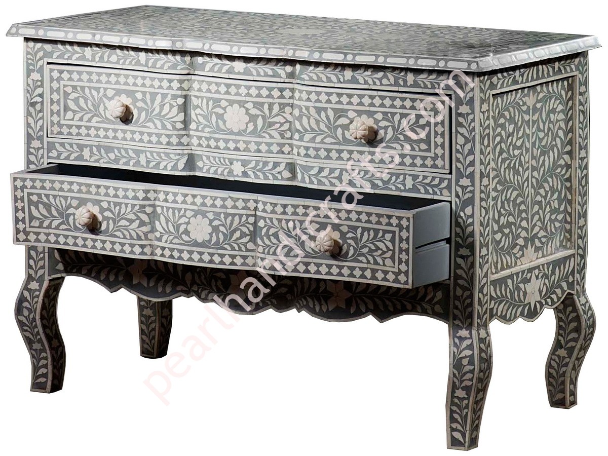 The bone inlay or Mother of pearl night stands and chest of drawers are made in the magical region of Rajasthan India, using bone and mother of pearl shell from Naturally dead Camel and cow. NO any animal harmed for the raw material.
