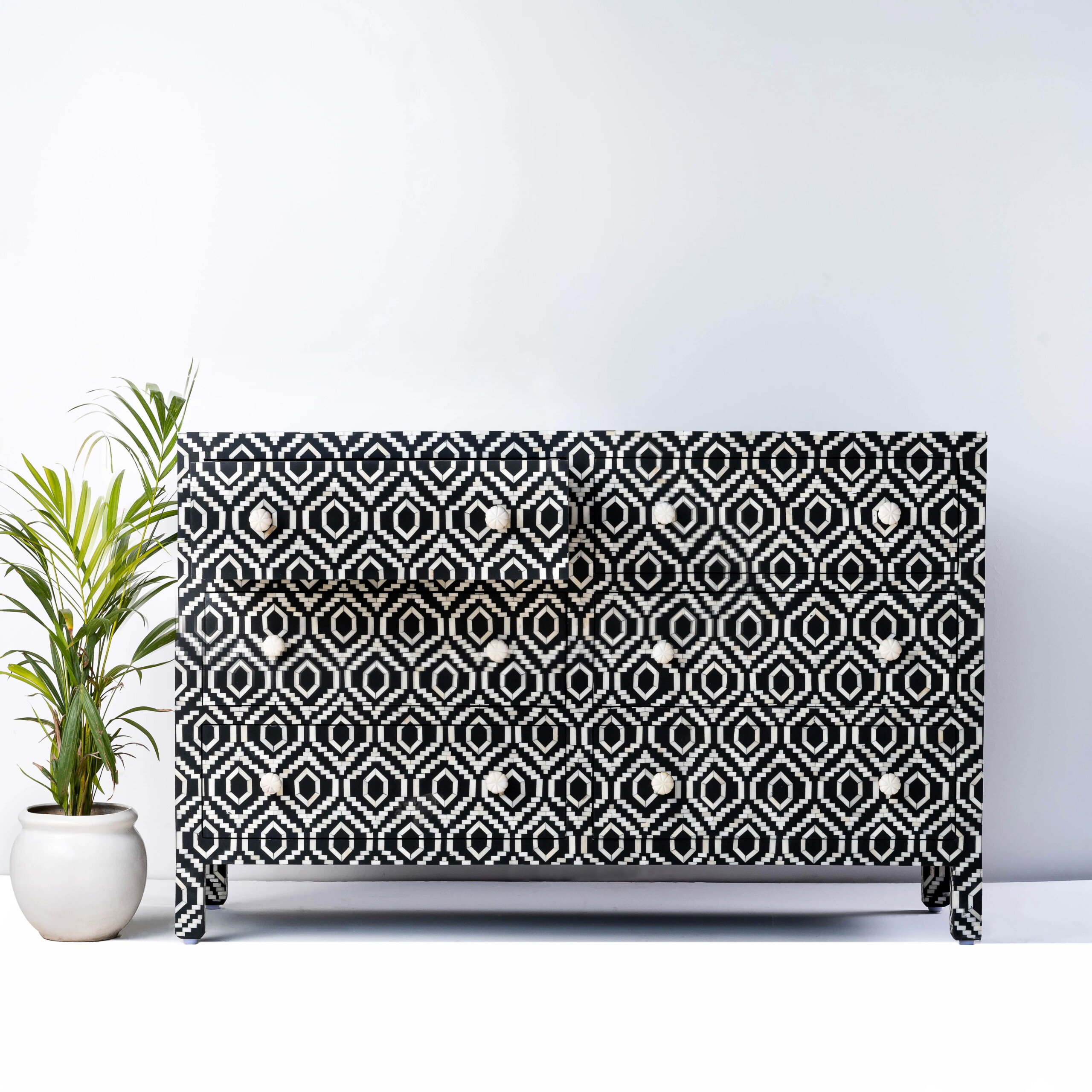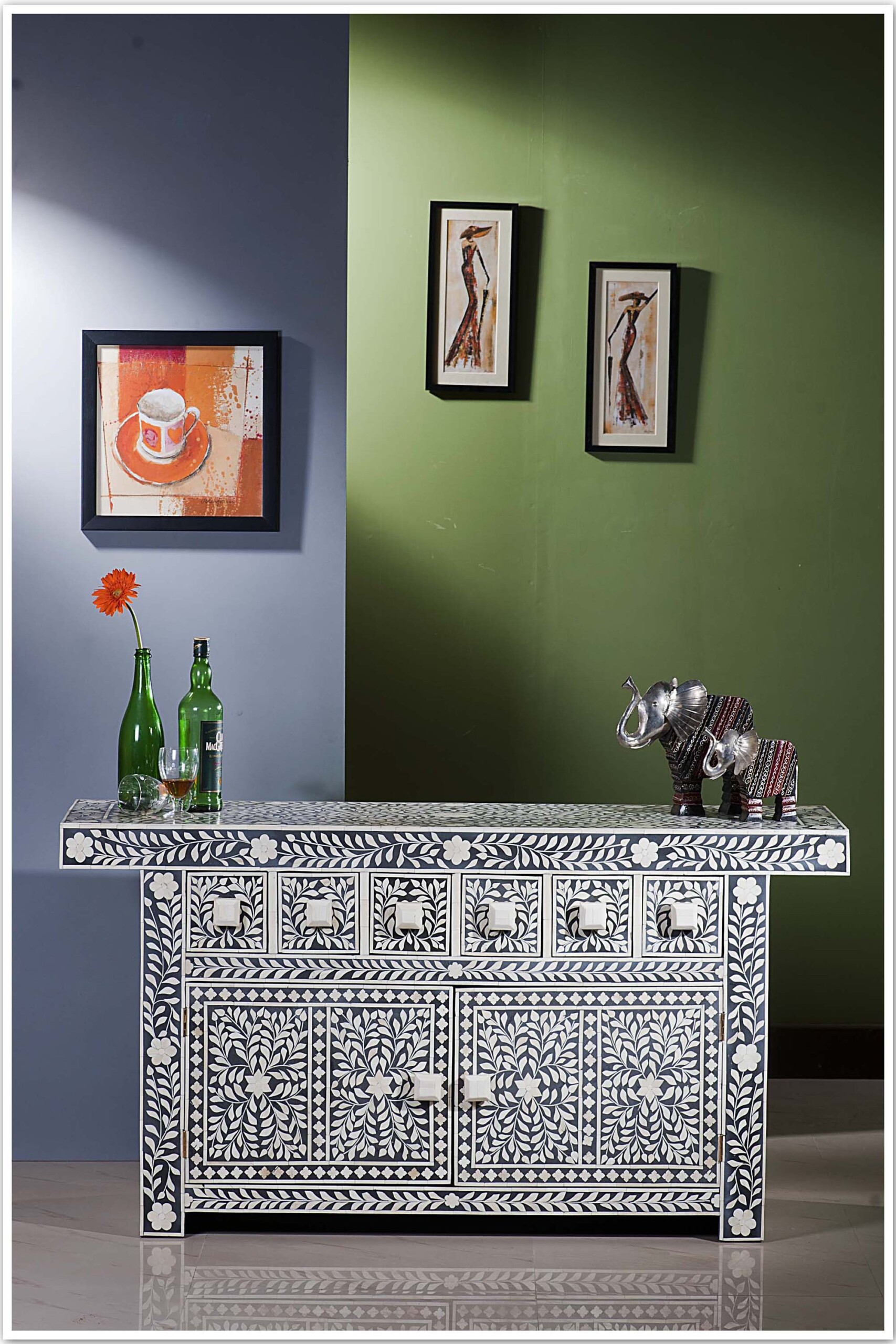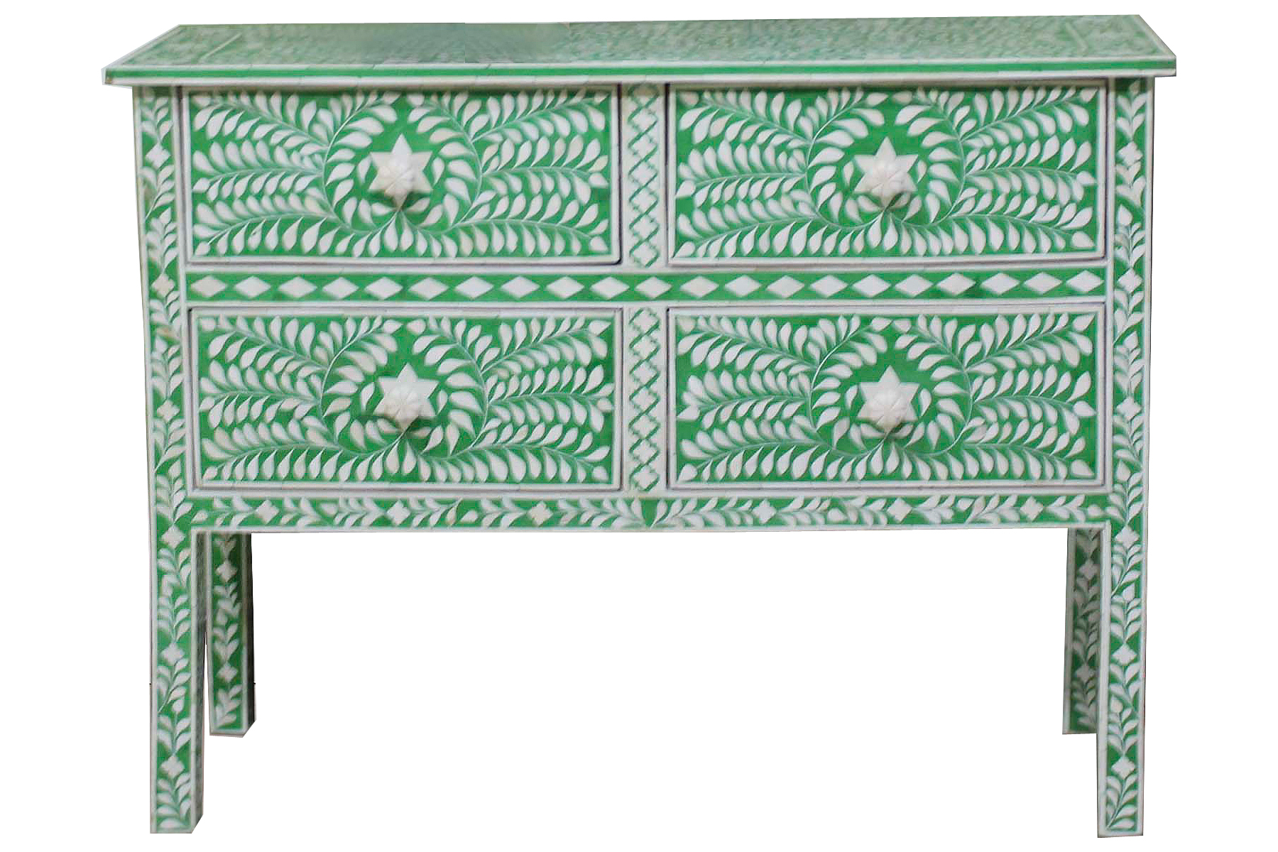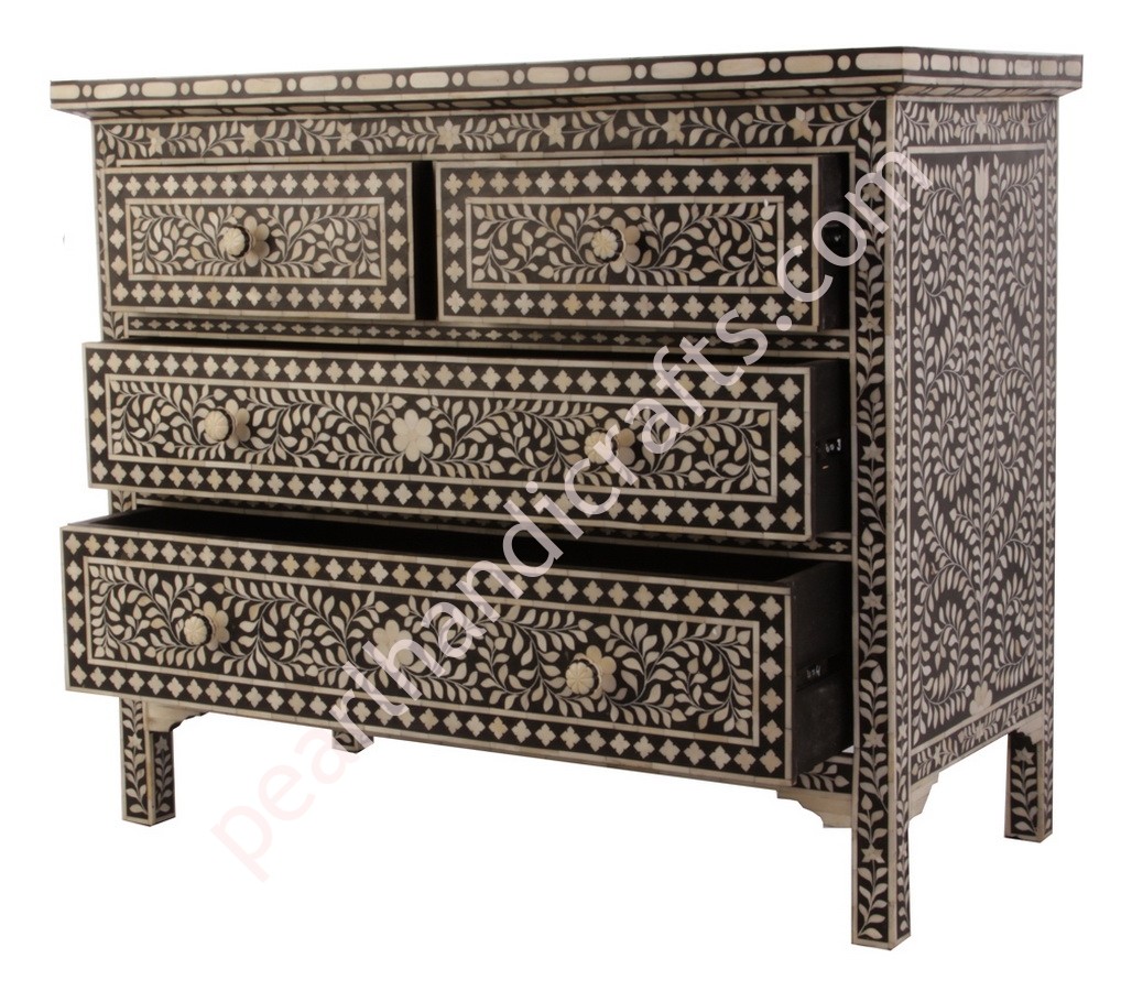 The Mother of pearl or bone inlay nightstands and chest of drawers are made in the magical region of Rajasthan India, using bone and mother of pearl shell from Naturally dead Camel and cow. NO any animal harmed for the raw material.