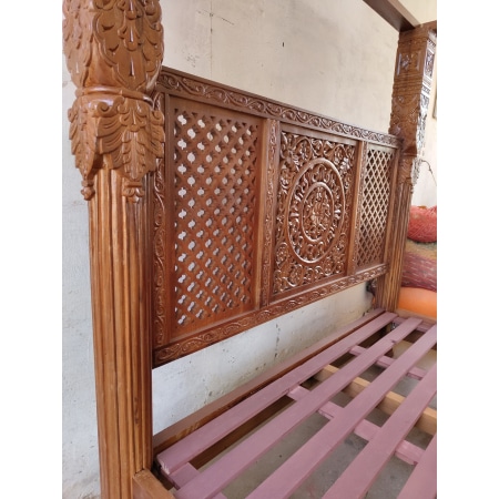 All the beds are made of Solid teak wood or rose wood only and polished with quality polish material like spirit and lacquer with final coat of melamine/ PU for smooth touch and make it weather proof . These all gives it strength, royal look, durability and weather resistant. It adds to your home gives you an elegant relaxing time.