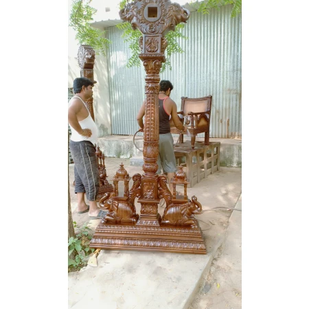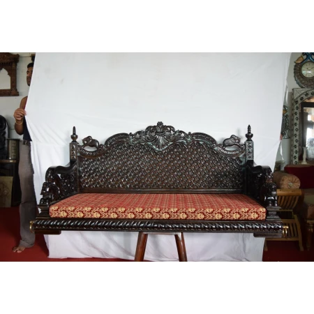 Beautifully designed and carved heavy solid 2 elephants at the base of the both lavishly carved pillars and the heavily fine carved base structure below the elephants give it a strong stability and attractive looking. The matching carving seat padded with fabric mattress. 2 small elephant heads at the top of the pillar and small peacocks at the center of the pillars make it a piece of art. Very skillfully crafted heavy bow shaped canopy . All these makes this swing perfect for your interior with customized polish shade.
