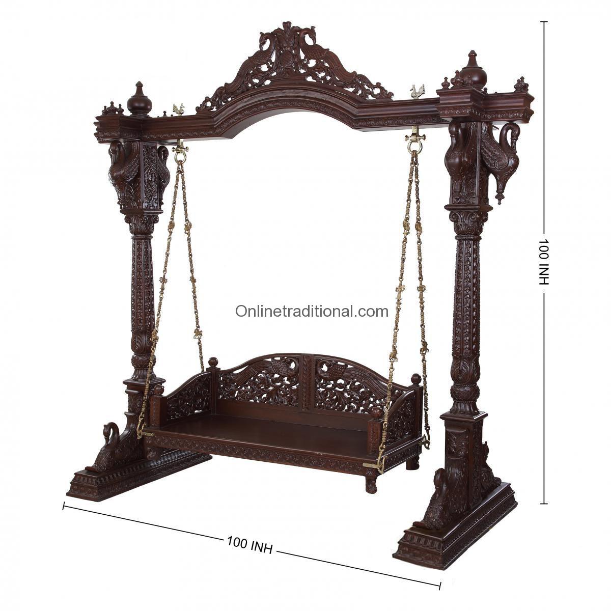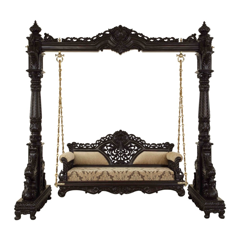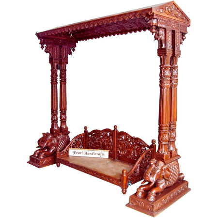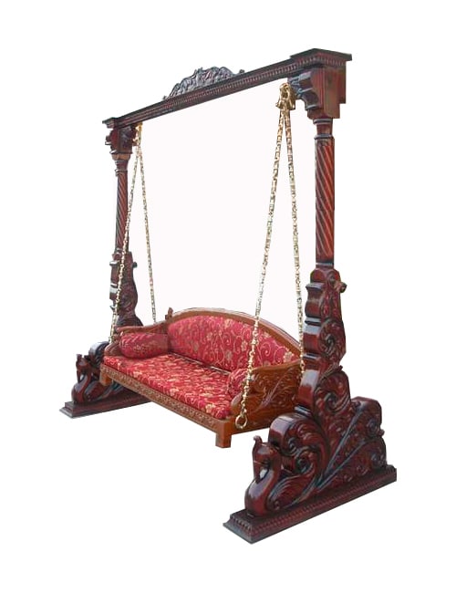 The double heavy carved pillars for strength. Excellent matching carving over the hanging seat makes it a piece of art. Beautiful solid wood seated elephants with fine carved ornaments at the base of the pillar. Solid box like structure at the base of the elephants for stability of the swing during oscillation. Floral design carved lower portion of the canopy. Seat cushion and Brass chain included.