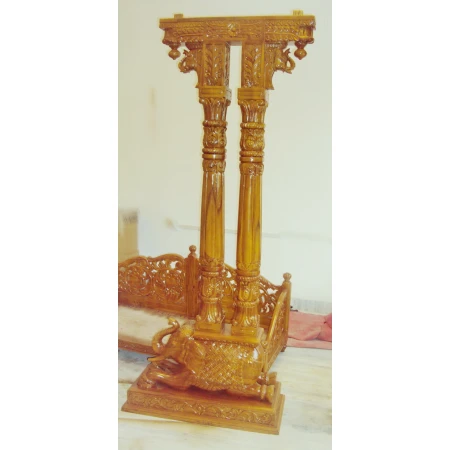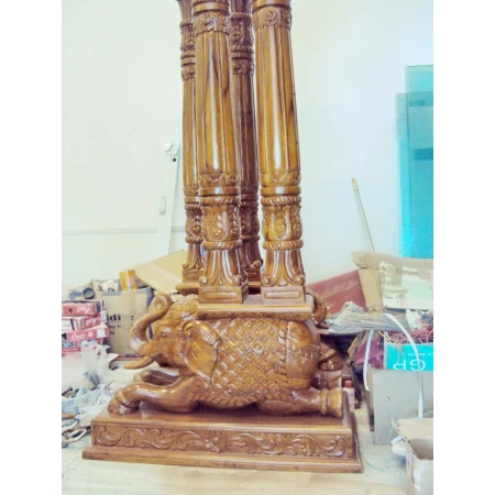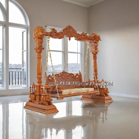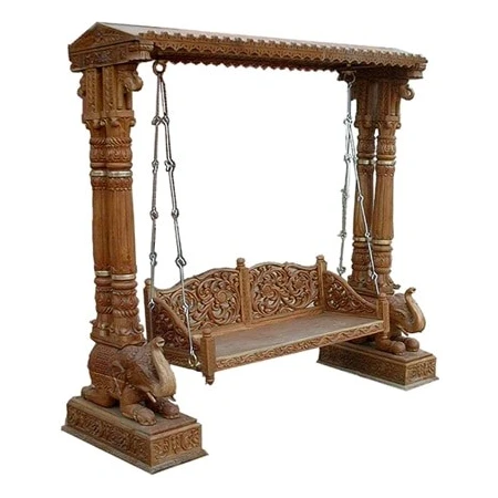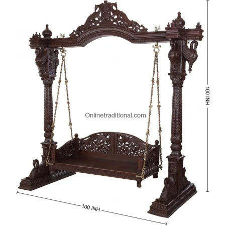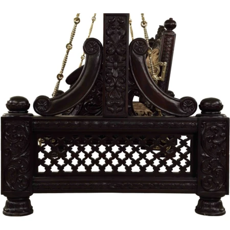 The double heavy carved pillars for strength. Excellent matching carving over the hanging seat makes it a piece of art. Beautiful solid wood seated elephants with fine carved ornaments at the base of the pillar. Solid box like structure at the base of the elephants for stability of the swing during oscillation. Floral design carved lower portion of the canopy. Seat cushion and Brass chain included.