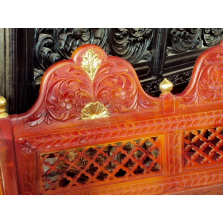 Beautifully carved Wooden Swing / jhoola with fine transparent “Jaali” carving between the 2 pillars on each side of the swing. Similar Patterned carved Seat completely made of teak wood only. Very deep, fine and detailed carving makes it a pieces of art. Solid round double pillars and heavy carved Canopy. 2 step solid box like structure base of the pillars for stability and strength. Detachable in 4 parts for easy and safe transportation. You can easily fix it with help of 2 adults only. Provided with heavy brass chains with adjustable length. Brass made bearing hanging hooks at the canopy for smooth and easy oscillation.