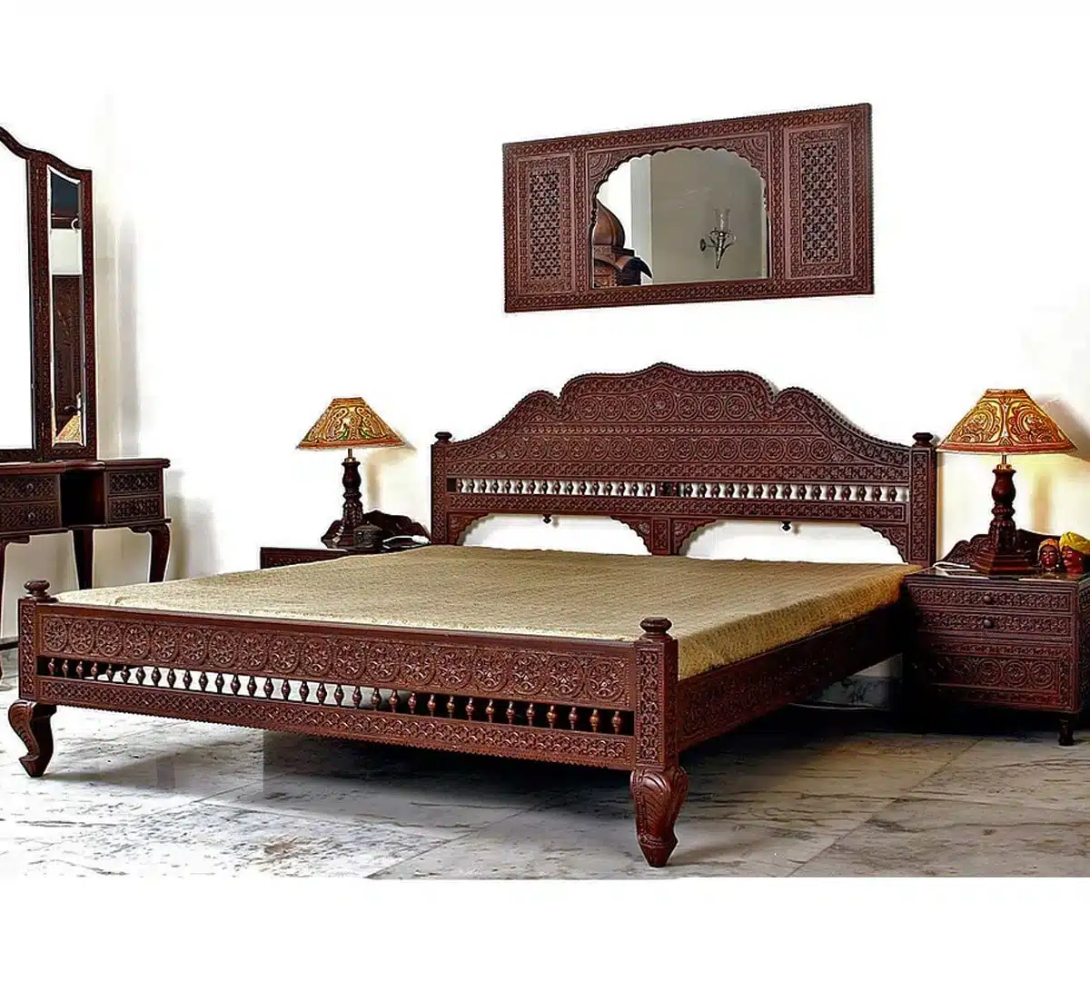 All the beds are made of Solid teak wood or rose wood only and polished with quality polish material like spirit and lacquer with final coat of melamine/ PU for smooth touch and make it weather proof . These all gives it strength, royal look, durability and weather resistant. It adds to your home gives you an elegant relaxing time.