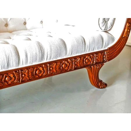 The front panel is delicately hand carved as well, in a floral leaf pattern, and the partial carved back features a unique  flower and leaves carving. This day bed is crafted from reclaimed Teak wood  with beautiful hand carved floral design.  Every detail has been careful carved into the entire love seat. The arms have scales carved into the inside angle, with an ornate carving on the exterior of the arms.