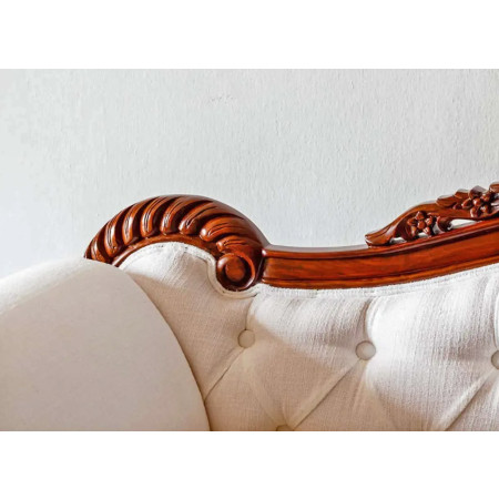 The front panel is delicately hand carved as well, in a floral leaf pattern, and the partial carved back features a unique flower and leaves carving. This day bed is crafted from reclaimed Teak wood with beautiful hand carved floral design. Every detail has been careful carved into the entire love seat. The arms have scales carved into the inside angle, with an ornate carving on the exterior of the arms.
