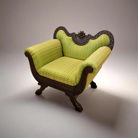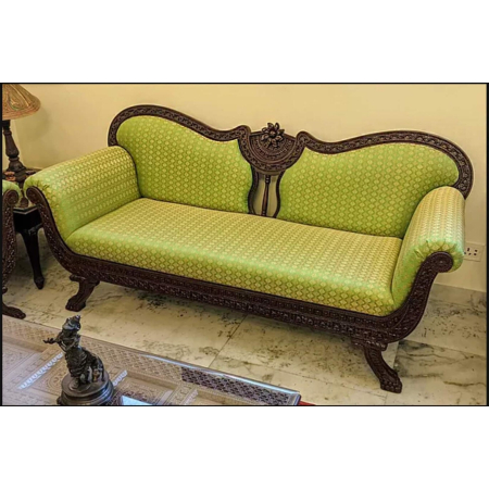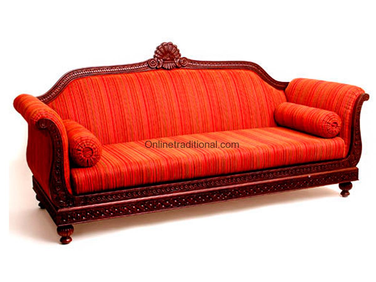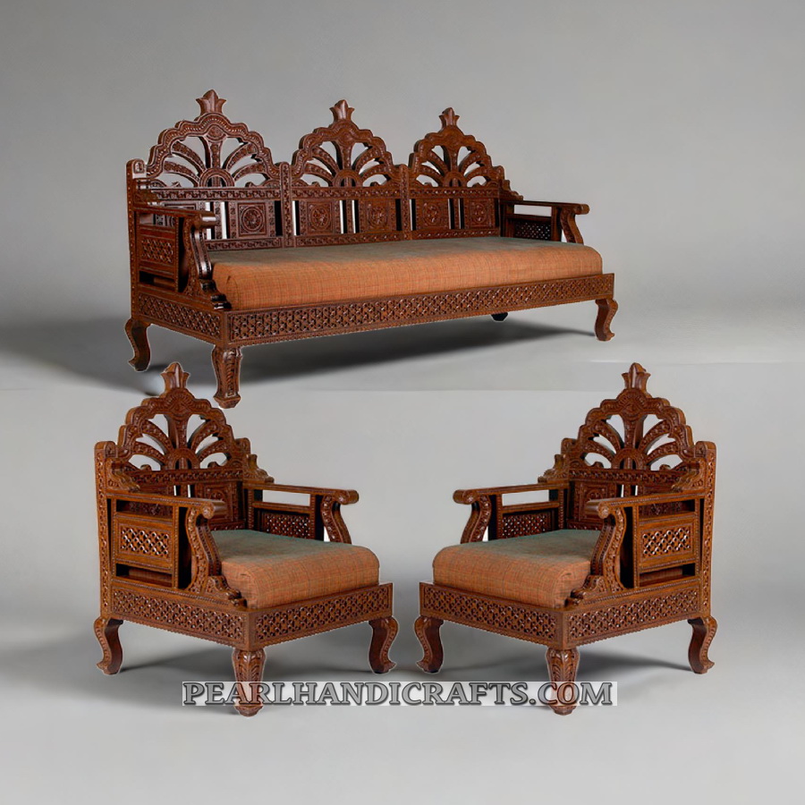 Teak wood sofa set with very fine carving pattern. The back of this traditional sofa set is designed in bow shaped pattern with a beautiful carved flower at the top of the back. The arms are fabricated with superior quality foam makes that give it quite modern look. This Indian sofa set with carving panel in front of the arms makes it attractive and beautiful. Very beautifully designed artistic but strong legs makes add one more star to its beauty.