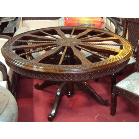 Dining made of Teak wood, beautifully carved and circular shape with small pillars in between the outer circular frame makes this dining table different from others. Octopus shaped legs gives it strength and stability as well as traditional beauty. Matching 6 chairs make a perfect set for your dining room.