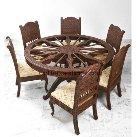 Dining made of Teak wood, beautifully carved and circular shape with small pillars in between the outer circular frame makes this dining table different from others. Octopus shaped legs gives it strength and stability as well as traditional beauty. Matching 6 chairs make a perfect set for your dining room.
