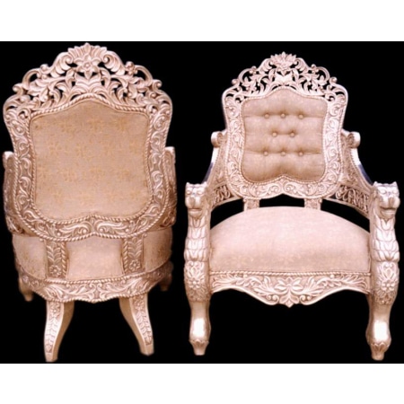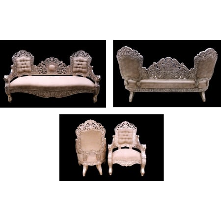 This Beautifully designed , carved and furnished Sofa set by Pearl Handicrafts can be made either with Silver or white metal (German silver) sheet mounted over carved wood. Skillfully carved two lions at both the end corners of arm rests and lion legs. Back rest and arms rest with some transparent carved flower design. From decades Silver or metal furniture gives a versatile option to decorate your interior with its unique design, craftsmanship and quality.