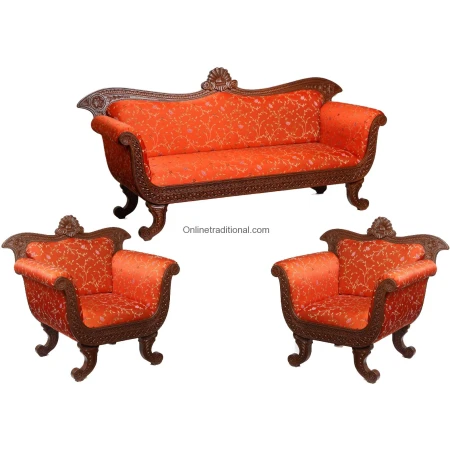Teak wood sofa set with very fine carving pattern. The back of this traditional sofa set is designed in bow shaped pattern with a beautiful carved flower at the top of the back. The arms are fabricated with superior quality foam makes that give it quite modern look. This Indian sofa set with carving panel in front of the arms makes it attractive and beautiful. Very beautifully designed artistic but strong legs makes add one more star to its beauty.