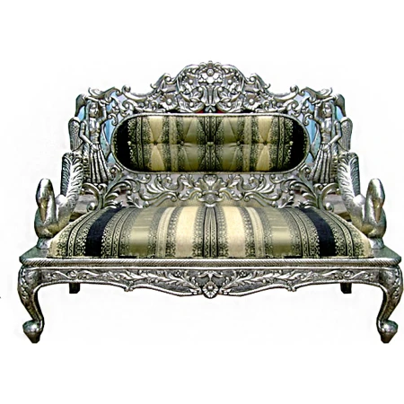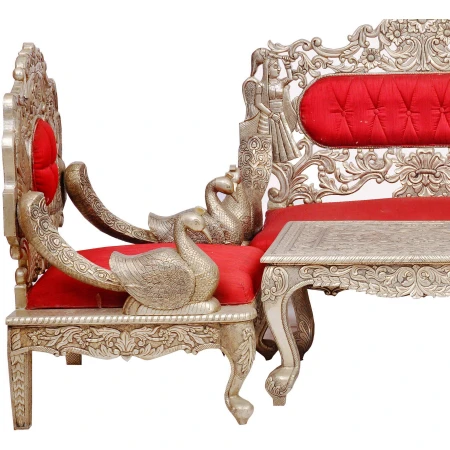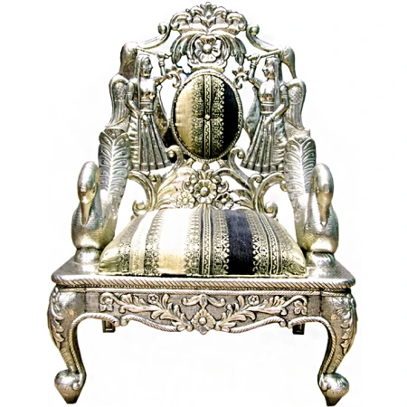 Silver mounted: 99% Purity of Silver sheet is used to mount and cover the carved wooden structure. Pure Silver sheet has a property of flexibility and shining that is favorable for mounting it over that deep carving without any cracks are wrinkles that gives a solid casted or molded silver look to the furniture. This process includes rolling the Pure Silver sheets, hammering, punching and re-carving on the wooden fine carved surfaces. This whole process is learnt generation to generation from the makers of furniture pieces of royal kings and emperors of Rajasthan. Most of the design are copied or modified from the furniture of the palaces and books of Udaipur, Jodhpur and Jaipur. This furniture gives a royal palace feeling to the interior.