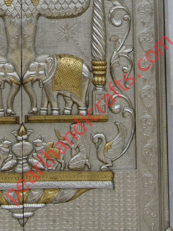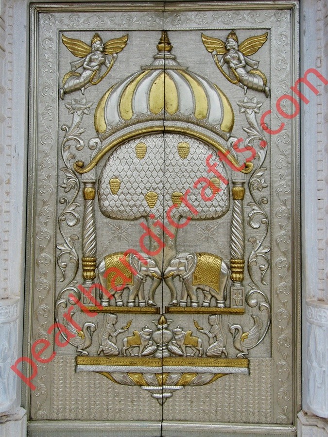 A very beautifully hand crafted double door made of teak for home temple, with deep carved Stutues of god and goddess . Matching carved frame available( chaoukhat) . Quality PU polished. We can customize the design and sizes as per the requirement.