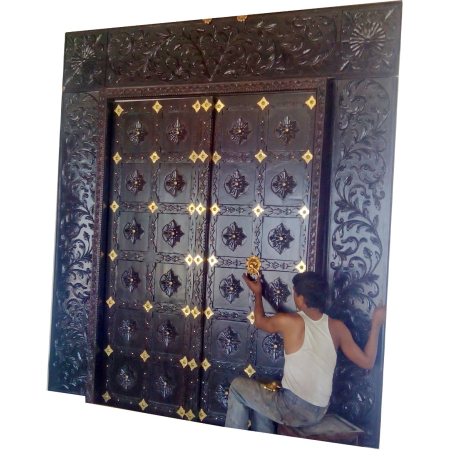 Beautifully Hand carved Teak wood door with floral carving and some brass accessories as decorates.