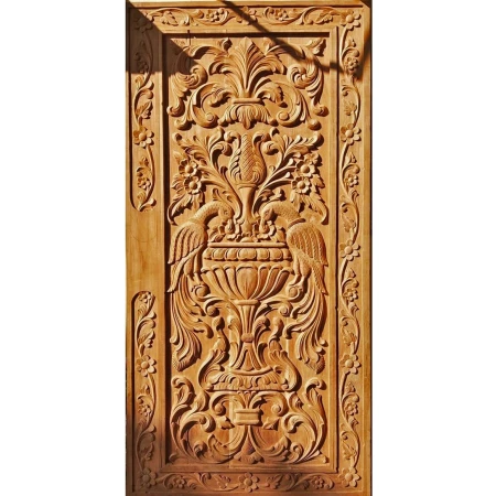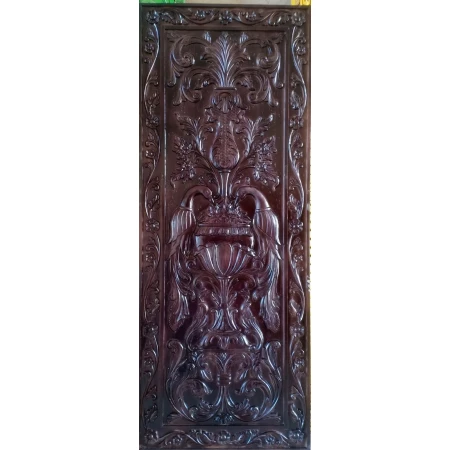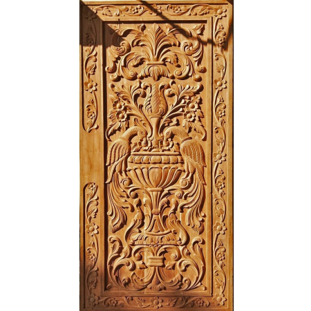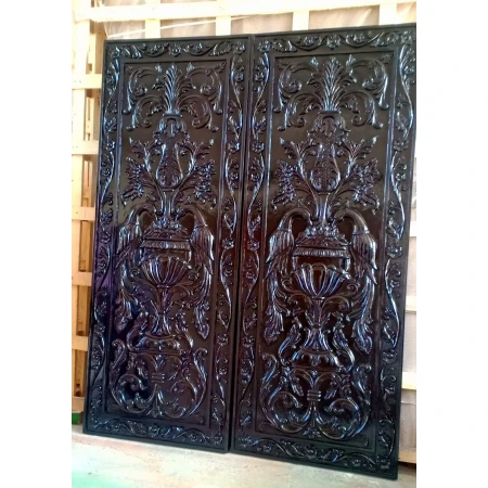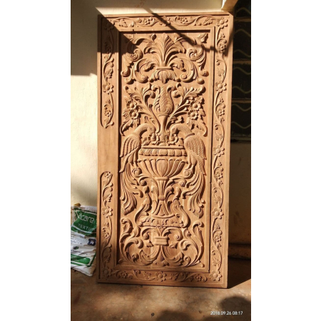 A very Beautifully crafted heavenly double door made of teak wood. 2 detailed carved peacocks with fine carved floral design in back ground. We can make matching frame or heavy paneled frame to give it more heavy and bulky look. Can also be decorated with some brass or iron ornamental and accessories. Quality melamine polished. We can alter the design and sizes as per your requirement.