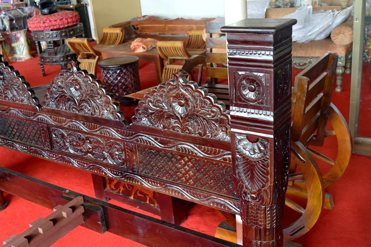 All the beds are made of Solid teak wood or rose wood only and polished with quality polish material like spirit and lacquer with final coat of melamine/ PU for smooth touch and make it weather proof . These all gives it strength, royal look, durability and weather resistant. It adds to your home gives you an elegant relaxing time.