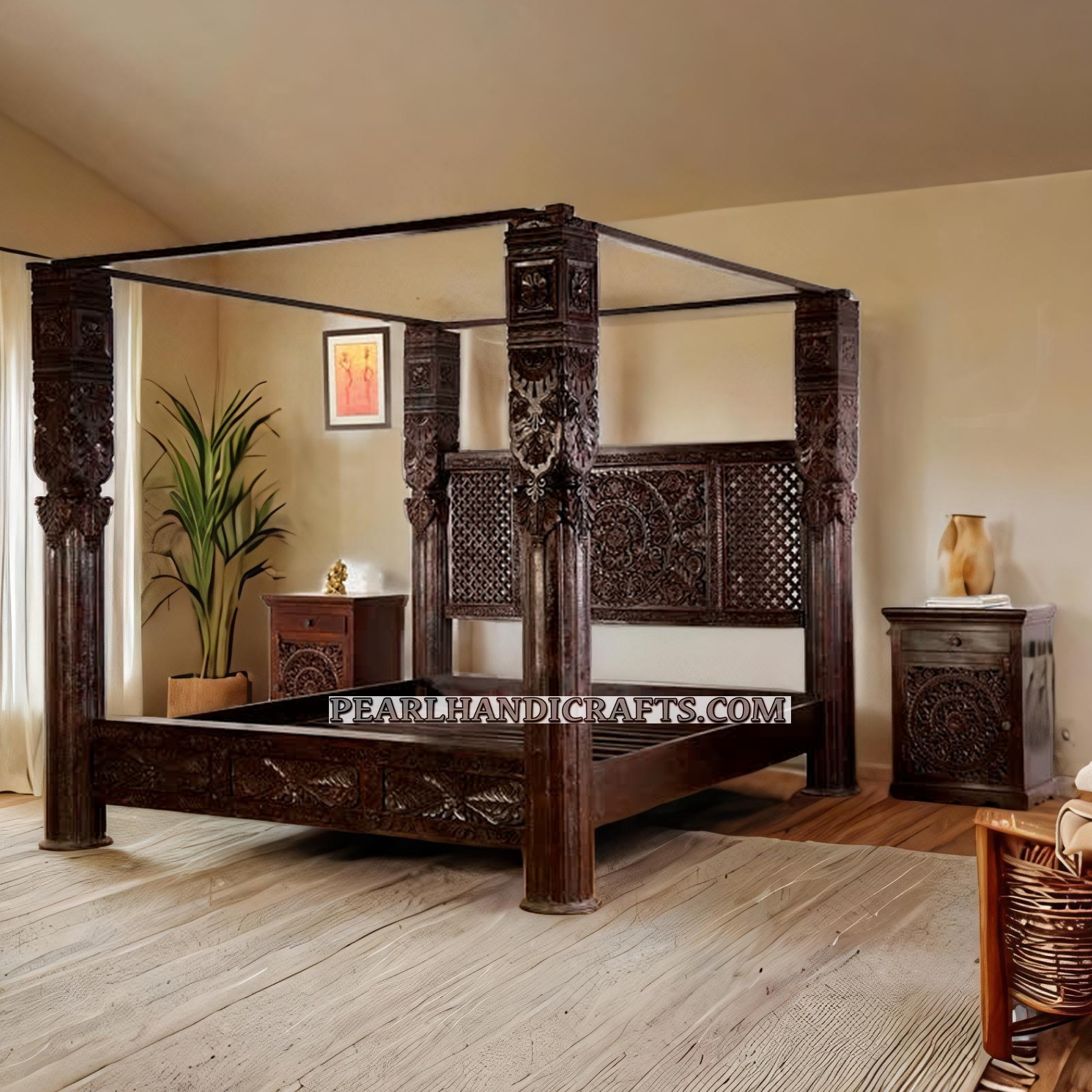 This Beautiful Indian Bed made of fine quality teak wood with deep and detailed carving. The head board of this bed is lavishly carved over solid teak wood with matching carved foot board. The head board and side boards of the bed are finely carved but in rectangular shape to match it with any type of interior. The side planks that attach the head board and foot board are also finely carved in same patterns. Matching bed sides / night stands with 3 drawers or one drawer and one wardrobe( can be customize) make this bed a perfect bed for your bedroom. Can be customized with storage below the mattress area.