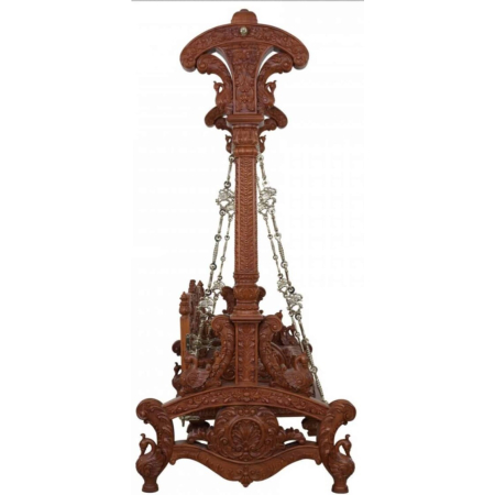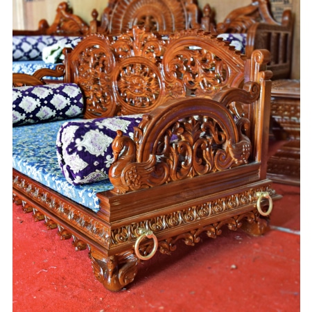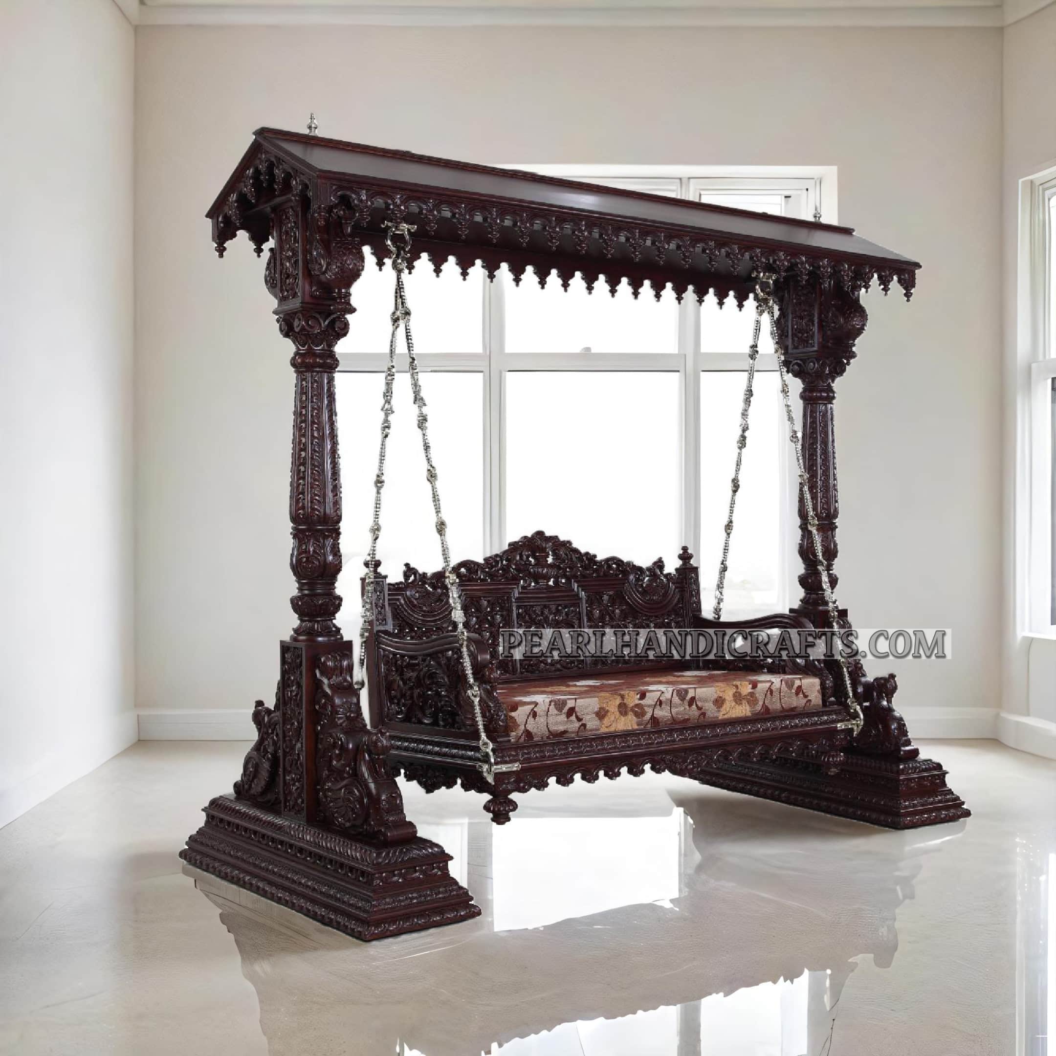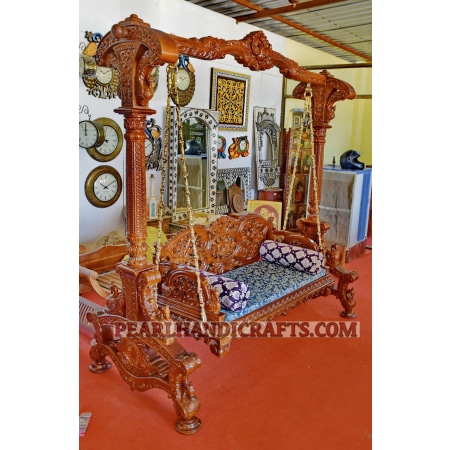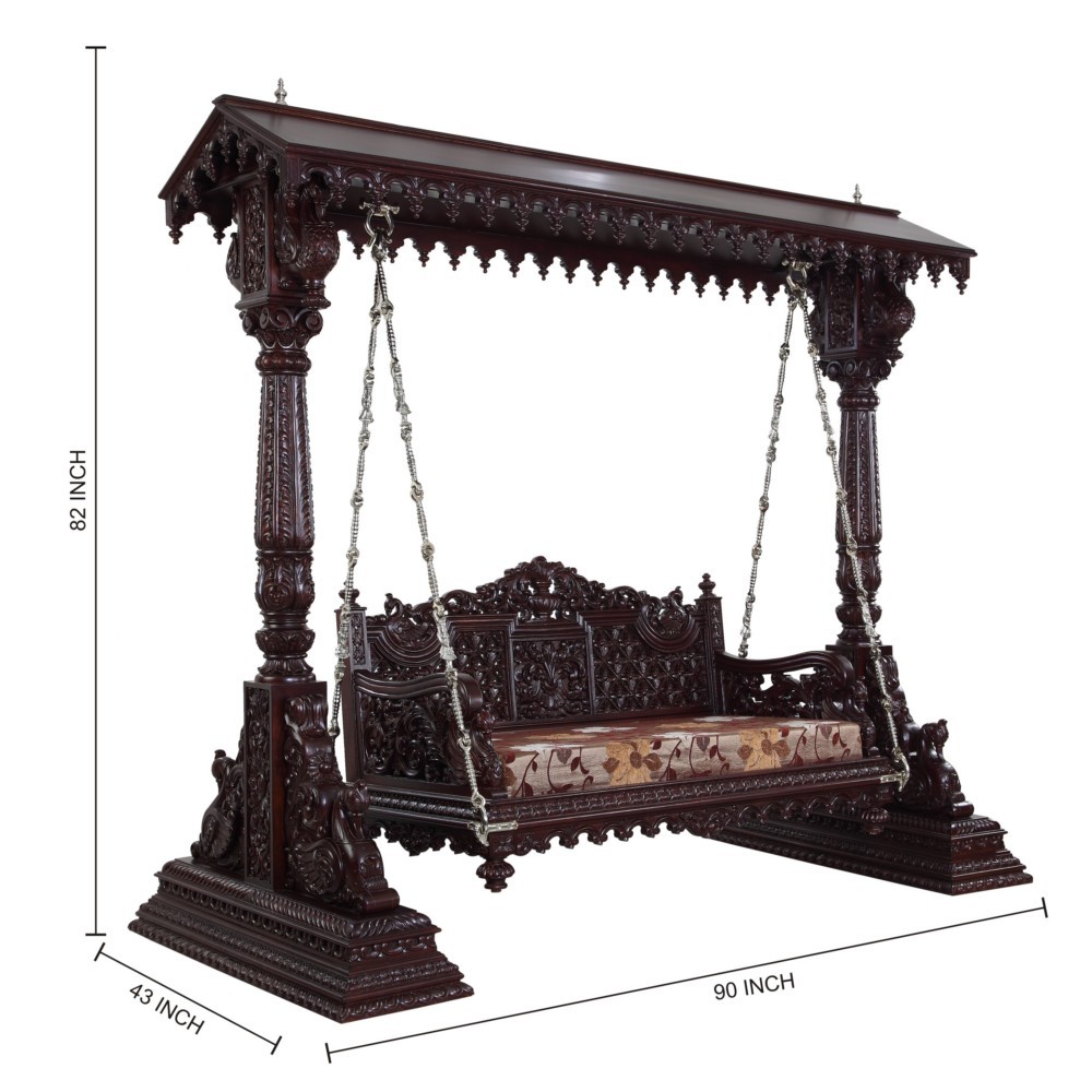 The beautifully carved peacocks at the base of the both pillars and the heavy box structure below the peacocks gives it a strong stability and excellent matching carved seat makes it a piece of art. very skillfully crafted heavy canopy . All these makes this swing perfect for your interior with customized polish shade.