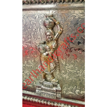 Beautifully hand crafted Doors with white metal / silver sheet mounted over carved teak wood model. This temple door is designed with partial brass mounting with white metal gives it a very lavish ornamental look. These doors designed specially of temples at home or out. These doors are quite stronger, durable and heavy. We can make customized design, modern design figures, statues of god, goddess, animals, birds, leaves and flowers, cubical shapes, circles and many more. We provide the matching outer frame also, if required.