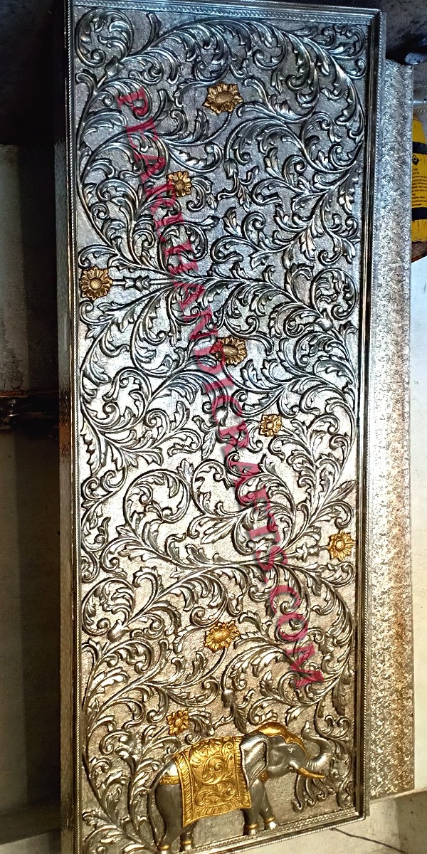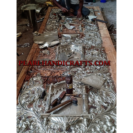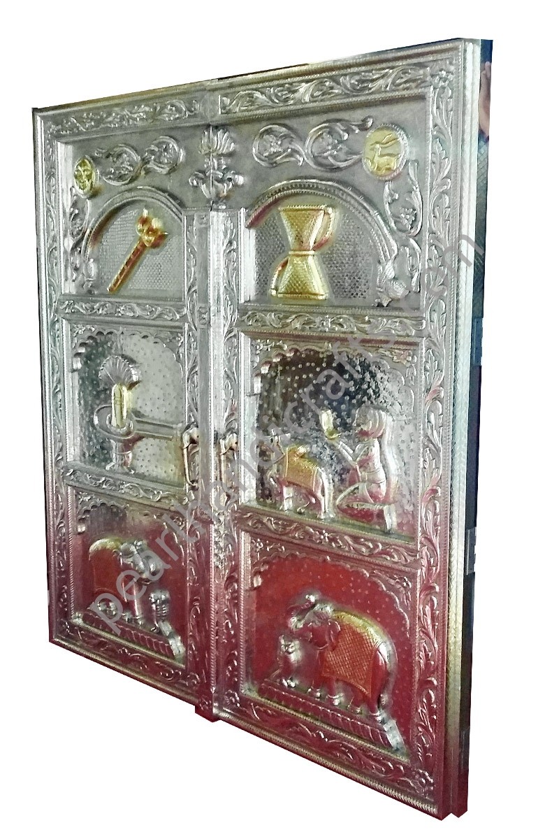 Temple doors or say metal mounted door with silver sheet or white metal sheet mounted over carved teak wood. White metal or called German Silver is not Silver. It is very economical, Shines and looks as silver. Due to this property we can use it instead of pure silver for much cheaper product. Also called EPNS. EPNS stands for Electro Plated Nickel Silver.