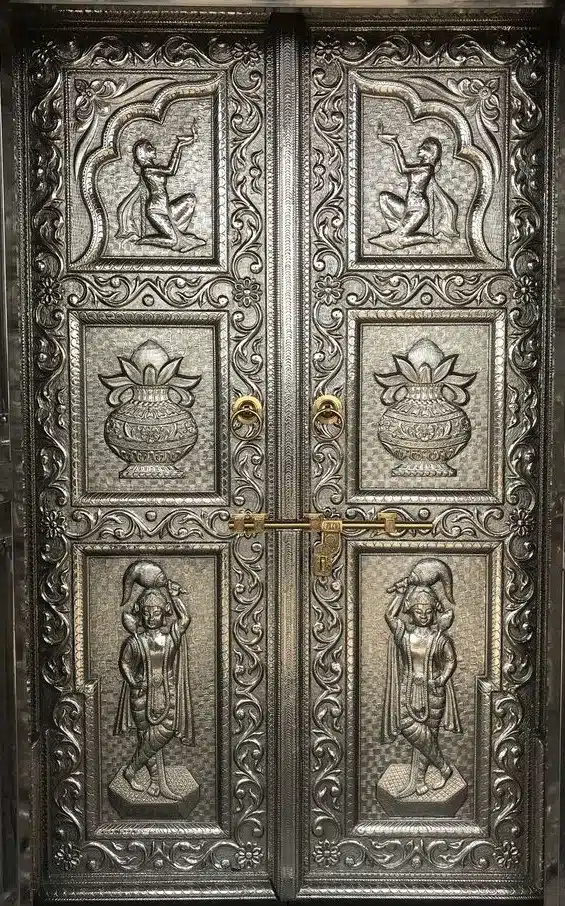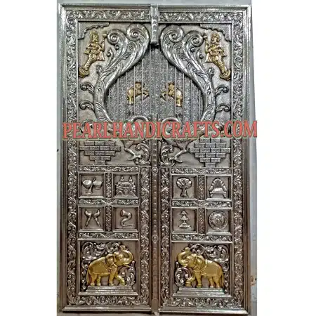 Temple doors or say metal mounted door with silver sheet or white metal sheet mounted over carved teak wood. White metal or called German Silver is not Silver. It is very economical, Shines and looks as silver. Due to this property we can use it instead of pure silver for much cheaper product. Also called EPNS. EPNS stands for Electro Plated Nickel Silver.