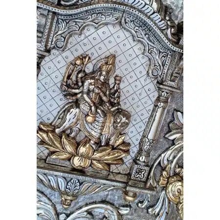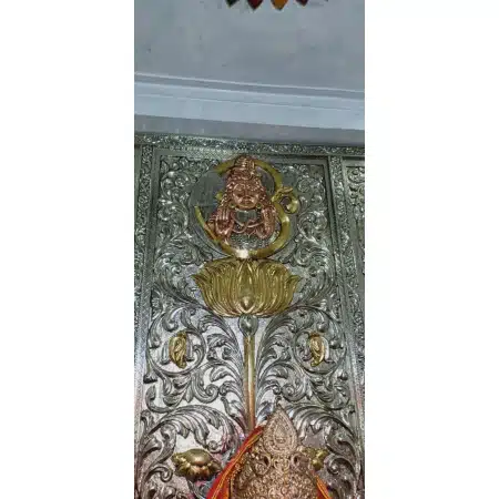 Transform your home into a place of divine elegance with our White Metal and Copper Temple Door mounted on teak wood. This finely crafted door is a seamless blend of artistry and spirituality, featuring a captivating Durga Mata design at its core. The intricate details and expert craftsmanship make it a symbol of devotion and beauty. The fusion of white metal and copper adds a touch of sophistication, making it a statement piece in your home temple.